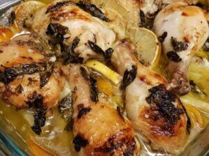 - משלבים בין חלקי העוף את פרוסות השומר ופרוסות הלימון.