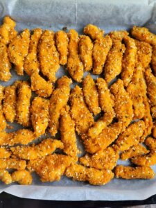 טובלים כל רצועת עוף בבלילת הביצה, ולאחר מכן מצפים היטב בתערובת פירורי הלחם מכל הצדדים.