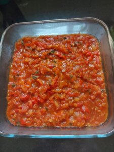 סלט עשיר של עגבניות ופלפלים קלויים – מושלם כממרח או כתוספת.