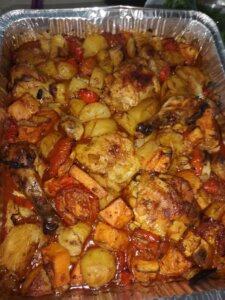לשפוך מעל את הרוטב ולעסות היטב עם הידיים את העוף ושאר הירקות להכניס לתנור לתנור שחומם מראש ל 180%כשעה