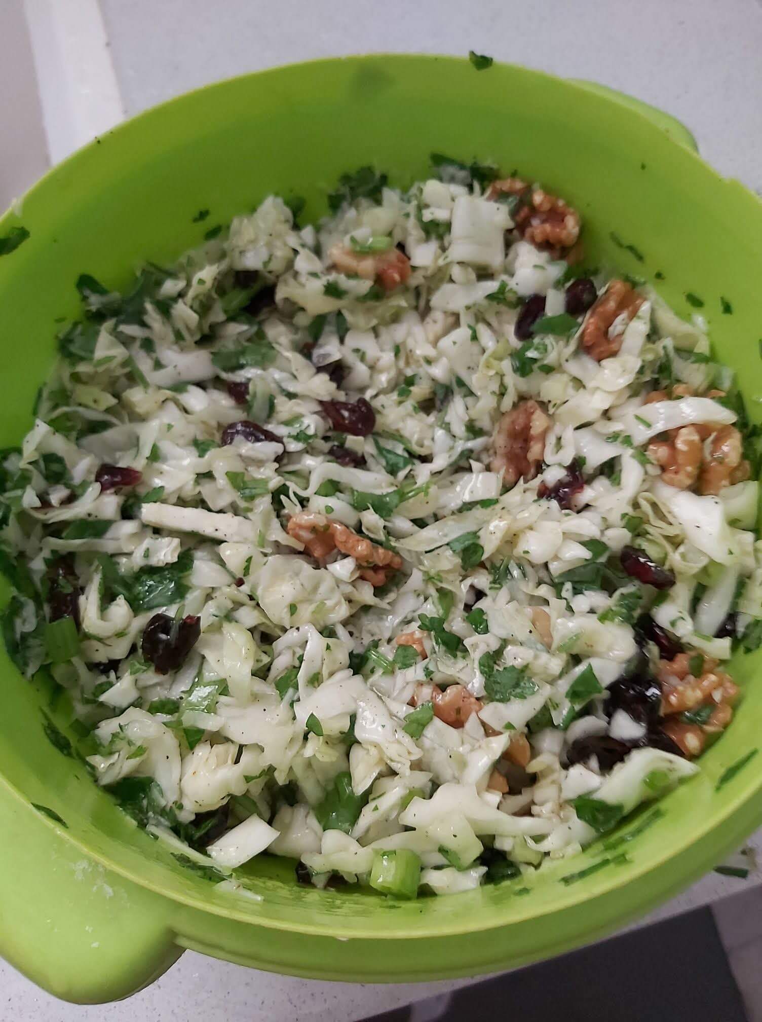 סלט כרוב טעים וקל להכנה עם מרכיבים נהדרים המצרכים- כרוב ירוק כחצי חצי כוס אגוזי מלך חצי כוס חמוציות חצי צרור מכל ירק