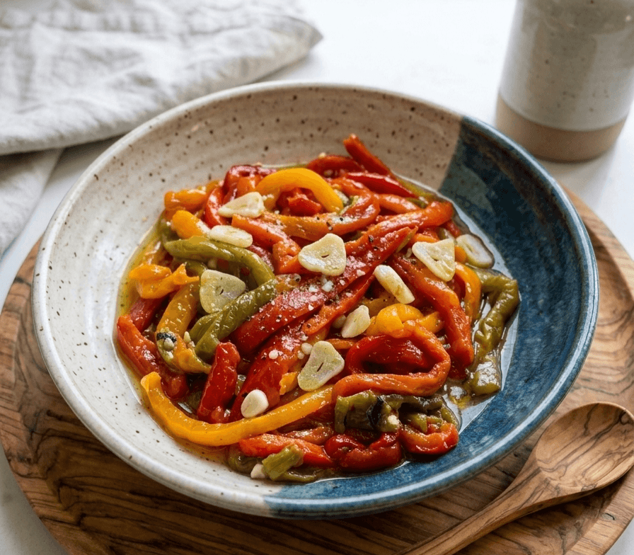 סלט פלפלים אהוב וקל להכנה המצרכים – 2 פלפלים אדומים אחד פלפל צהוב או כתום פלפל ירוק חריף 3 שינים שום פרוסות מלח